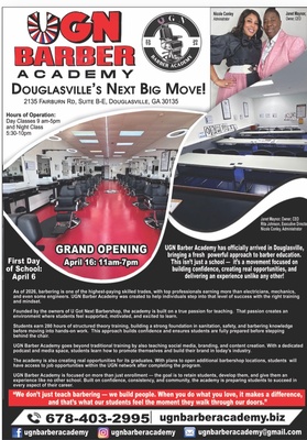 Please join us for a Ribbon Cutting to celebrate and welcome UGN Barber Academy to our community! UGN Barber Academy is a hands-on training program in Douglasville dedicated to preparing the next generation of professional barbers. Our 12-month program combines real-world experience in a working barbershop with instruction in technical skills, professionalism, and business development.